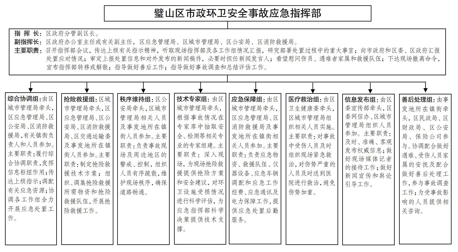 设立璧山区市政环卫安全事故应急指挥部,负责统筹协调较大及以上事故,由指挥长、副指挥长和成员单位组成。