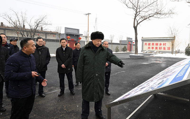 1月26日至27日,中共中央总书记、国家主席、中央军委主席习近平来到山西,看望慰问基层干部群众。这是26日下午,习近平冒雪在临汾市霍州市师庄乡冯南垣村考察。新华社记者 李学仁 摄