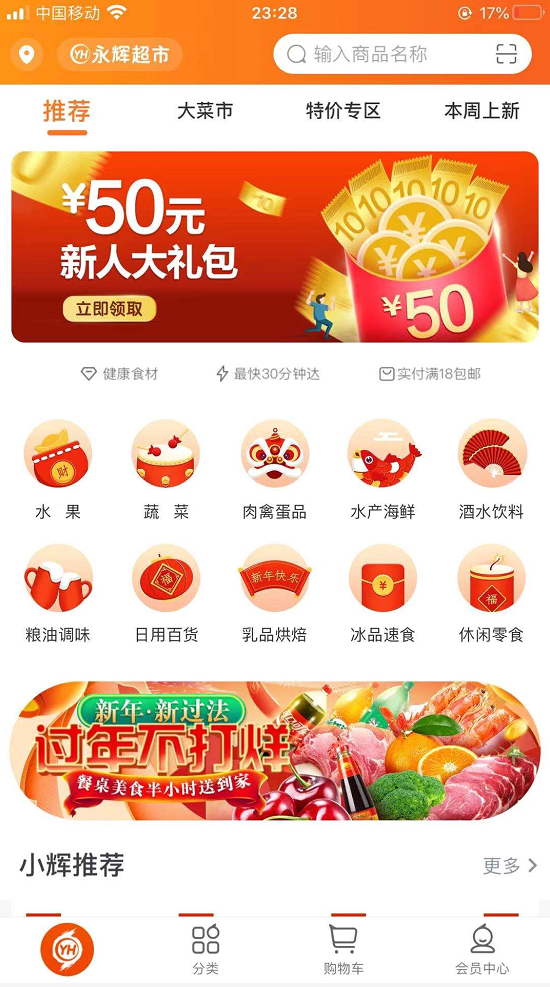打开APP,注册登录并填写收货地址后,即可实现重百超市线上购蔬菜、粮油、酒水等生活用品。