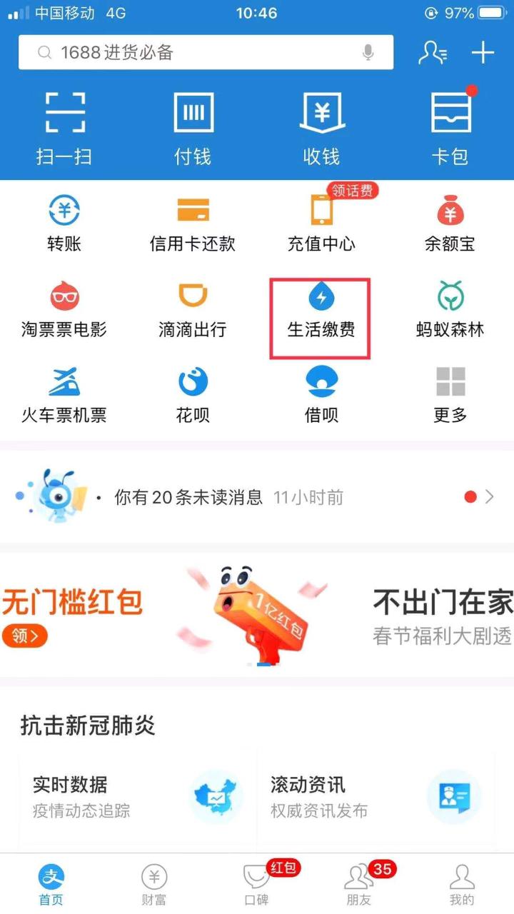 打开支付宝APP,点击首页“生活缴费”。