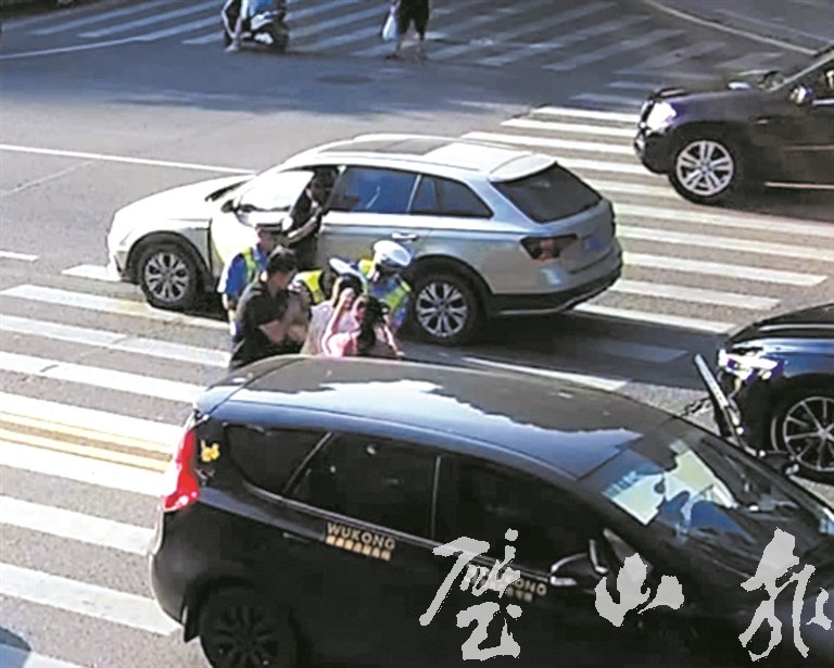 当时地面温度高达55℃,路面来往车辆川流不息,情况十分危险。这时,一辆黑色小车停了下来,车上下来的年轻男子急忙跑到民警身旁。
