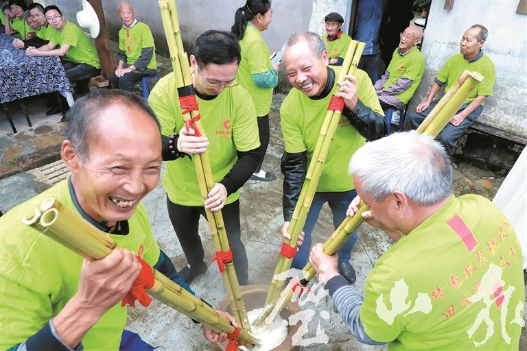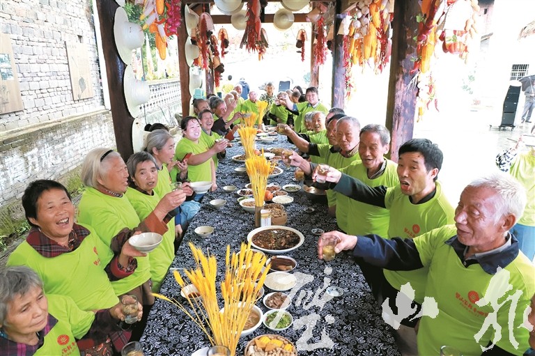 “起笼咯……”伴随着村民悠长高昂的吆喝声,寓意着“蒸蒸日上”的蒸笼被揭开,活动的重头戏“丰收长宴”也正式拉开帷幕,五谷丰登、南瓜八宝饭、大刀烧白、来凤鱼、璧山兔等一碗碗寄托着美好愿望的菜肴被送上餐桌,围坐长桌两旁的村民大快朵颐并直呼“过瘾”,笑声、欢呼声萦绕着整个院子。