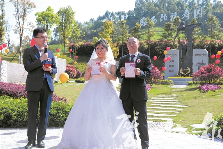婚礼的主角是75岁的新郎易泽成和65岁的新娘陈茂秀,他们都来自我市红十字志愿服务队,都已经登记成为人体器官捐献志愿者。陈茂秀、易泽成夫妇把婚礼的地点选择在西郊福寿园令所有人震惊,但在新郎易泽成看来,婚礼在纪念园里举行“毫不意外”。“之所以将婚礼选择在纪念园,是因为我们都是遗体器官捐献志愿者,在我们心里,早已将这里认定为我们最终的归宿。”