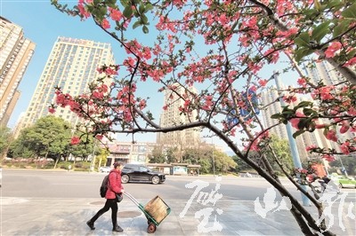 3月3日,东林大道的海棠花开别样红。(记者 曾清龙 摄)