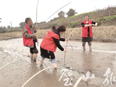 大兴镇志愿者帮助困难农户搭棚覆膜(记者 尹秀秀 摄)