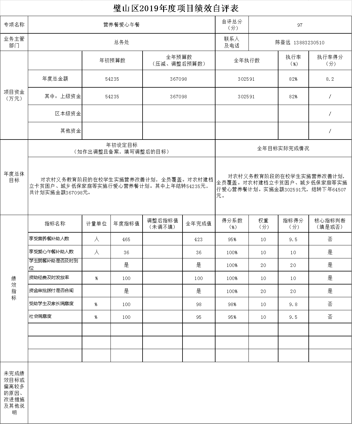 营养餐爱心午餐项目绩效目标自评综述:根据年初设定的绩效目标,项目总体完成情况对农村义务教育阶段的在校学生实施营养改善计划,全员覆盖。项目全年预算数为36.71万元,执行数为30.26万元,完成预算的82%。主要产出和效果:对农村义务教育阶段的在校学生实施营养改善计划,全员覆盖。其中享受营养餐补助人数465人,享受爱心午餐补助人数36人。发现的问题及原因:无。下一步改进措施:无。