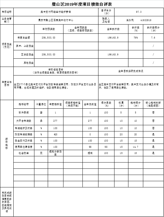 集中支付网络运行维护费项目绩效目标自评综述:根据年初设定的绩效目标,项目总体完成情况如下:全区集中支付平台运转正常,集中支付业务办理及时有序,做到了使用单位满意。项目全年预算数为25.65万元,执行数为19.62万元,完成预算的76%。主要产出和效果:一是完成大平台277条专线的维护,保证其正常运转,做到财政专线运行零故障;二是财政资金支付及时率达到100%,使用单位满意度达98%。发现的问题及原因:使用单位满意度未达到100%。下一步改进措施:进一步提高使用单位满意度。
