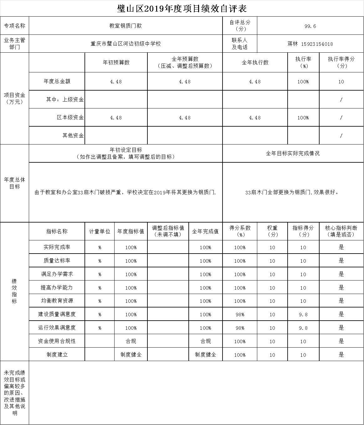 综述:根据年初设定的绩效目标,项目总体完成情况很好。项目全年预算数为4.48万元,执行数为4.48万元,完成预算的100%。主要产出和效果:一是满足了部分办学需求,二是提高了办学能力。发现的问题及原因,一是资金问题没有早实施此项目,二是单位还有需更换的。下一步改进措施,一是作好资金的合理安排,二是尽早实施重点项目。