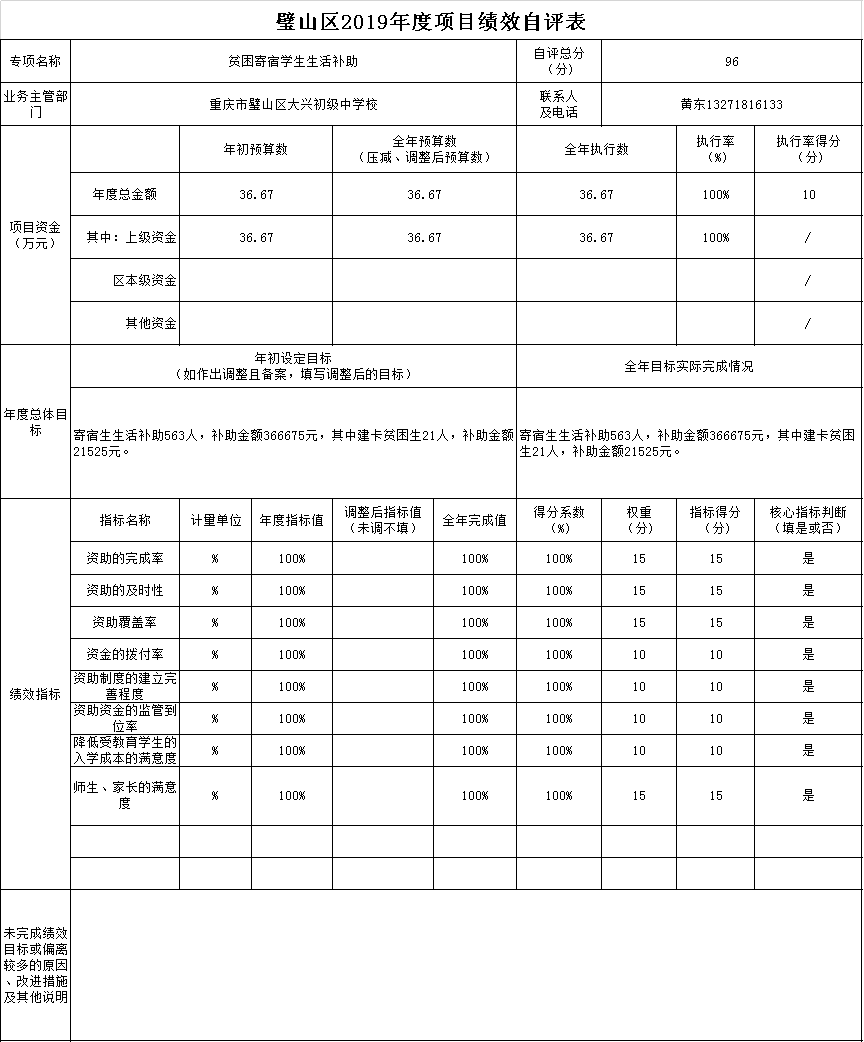 贫困寄宿学生生活补助项目绩效目标自评综述:根据年初设定的绩效目标,项目总体完成情况好。项目全年预算数为36.67万元,执行数为36.67万元,完成预算的100%。主要产出和效果:享受寄宿生生活补助563人,补助金额36.67万元,其中建卡贫困生21人,补助金额2.15万元。一是确保我校家庭经济困难的寄宿生不因家庭经济困难而辍学;二是确保寄宿生生活补助金及时足额的发放到最急需的家庭经济困难的学生手中。发现的问题及原因:个别家长或学生对资助政策了解不到位,产生原因为个别家长或学生对资助政策的不够关注。下一步改进措施:加强资助政策宣传、资格审查及资助的透明度,确保公平公正。