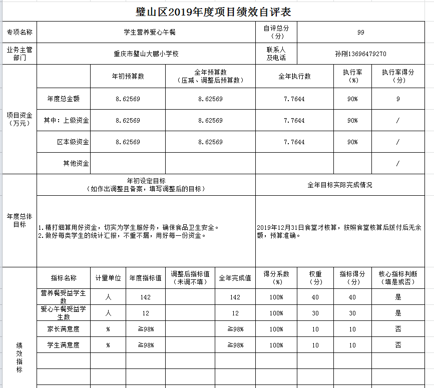 学生营养餐项目绩效目标自评综述:根据年初设定的绩效目标,项目总体完成情况好。项目全年预算数为8.63万元,执行数为7.76万元,完成预算的90%。主要产出和效果:一是学生营养餐受益人数142人,爱心午餐受益人数12人,二是学生和家长满意度高。