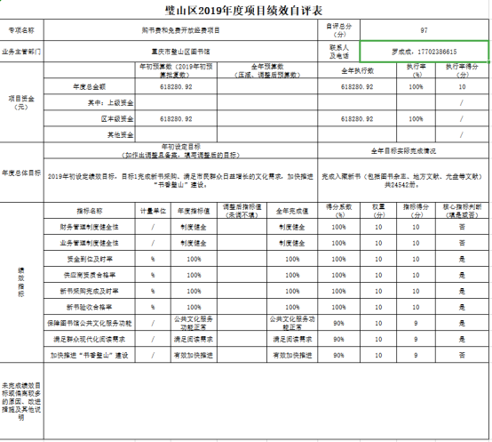 “购书费和免费开放经费”项目绩效目标自评综述:根据年初设定的绩效目标,项目总体完成情况好。涉及购书费和免费开放经费618280.92元,资金到位率100%,资金执行率100% 。主要产出和效果:完成新书的采购。免费开放专项资金。开展讲座48次,举办展览42场,开办培训班29个,阅读推广活动42场。其中,供应商资质合格率100%、新书采购完成及时率100%、新书验收合格率100%。满足了市民群众日益增长的文化需求及现代化阅读需求;加快推进了“书香璧山”的建设。
