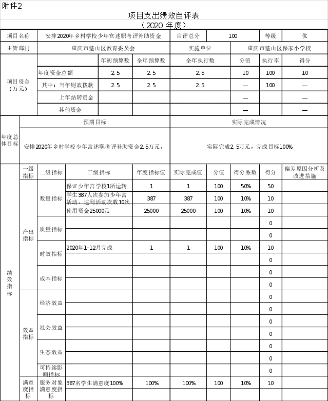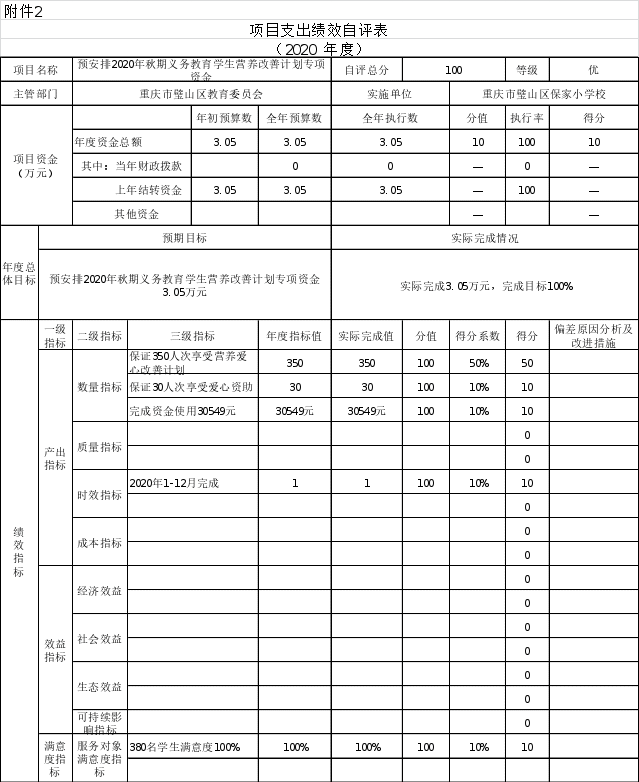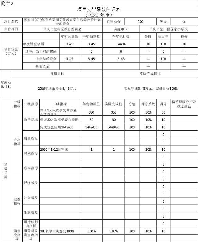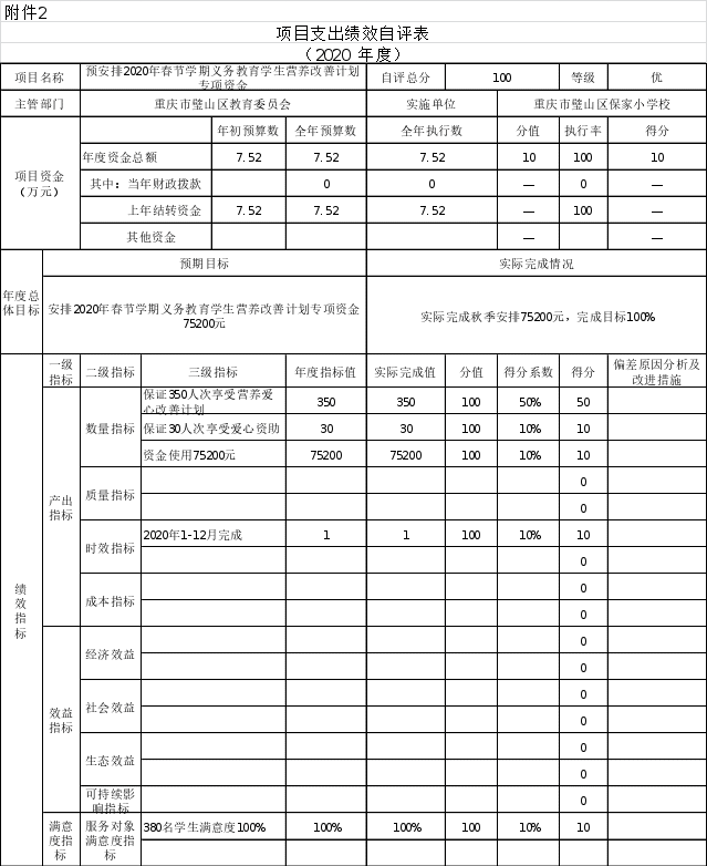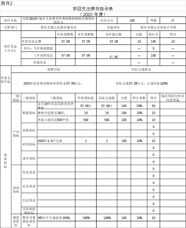 根据预算绩效管理要求,本部门对6个项目开展了绩效自评,其中,以填报目标自评表形式开展自评6项,涉及资金56.61万元,其中涉及2019年结转项目资金营养爱心补助项目3.45万元,2019年城乡义务教育经费保障机制校舍维修补助资金项目37.08万元,。2020年安排乡村少年宫述职考评补助资金2.5万元,2020年乡村少年宫项目运行及补助资金3万元,2020年春义务教育学生营养关爱改善计划专项资金3.05万元,2020年秋7.52万元,合计涉及资金56.61万元。从评价情况来看,自评总分100分,执行率100%。从项目资金使用进度合理,绩效目标完成度适中,项目整体绩效水平适中,资金使用效益较好。
