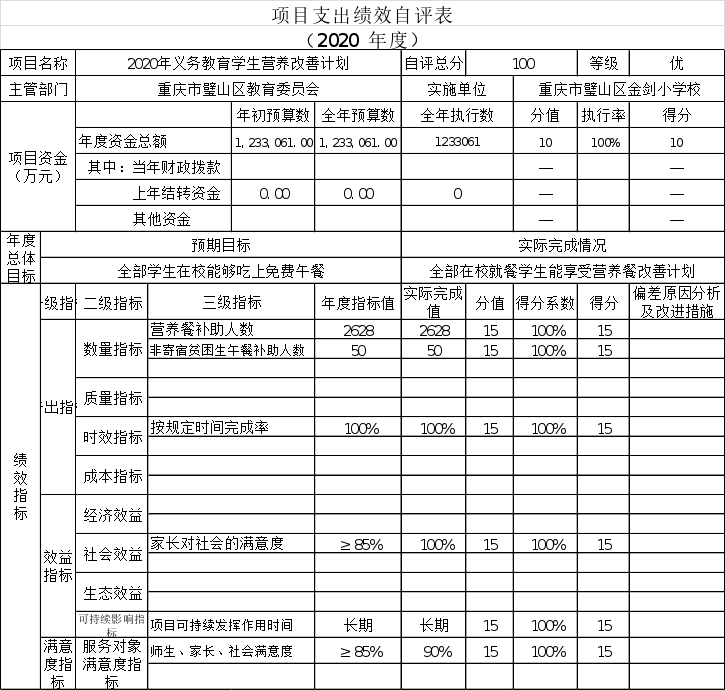 本部门学生营养餐项目绩效目标自评综述:根据年初设定的绩效目标,项目总体完成情况好。项目全年预算数为123.3万元,执行数为123.3万元,完成预算的100%。主要产出和效果:一是学生营养餐受益人数2628人,爱心午餐受益人数50人,二是学生和家长满意度高。