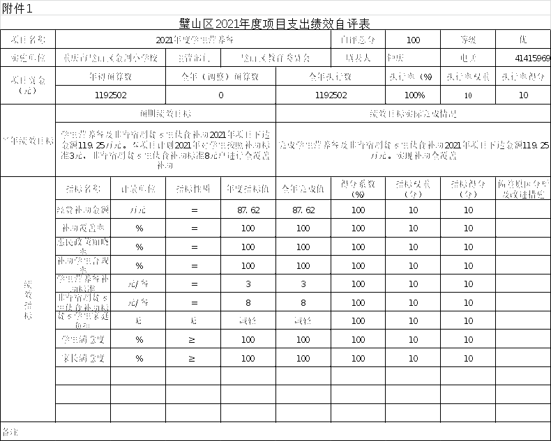本部门学生营养餐项目绩效目标自评综述:根据年初设定的绩效目标,项目总体完成情况好。项目全年预算数为119.25万元,执行数为11.25万元,完成预算的100%。主要产出和效果:一是学生营养餐受益人数2608人,爱心午餐受益人数50人,二是学生和家长满意度高。