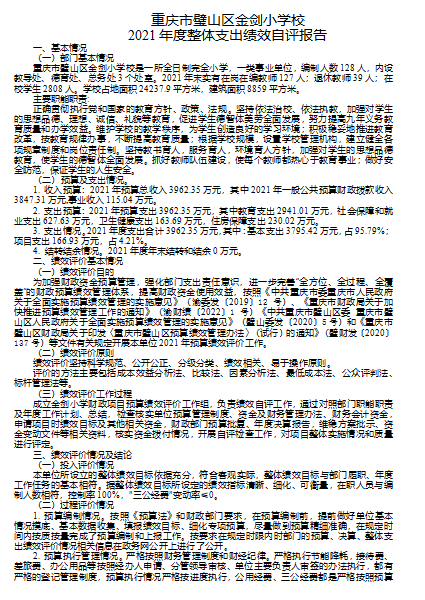 重庆市璧山区金剑小学校是区政府的一所全日制完全小学,一类事业单位,编制人数128人,内设教导处、德育处、总务处3个处室。2021年实有在岗在编教师127人;退休教师39人;在校学生2808人。学校占地面积24237.9平方米,建筑面积8859平方米。