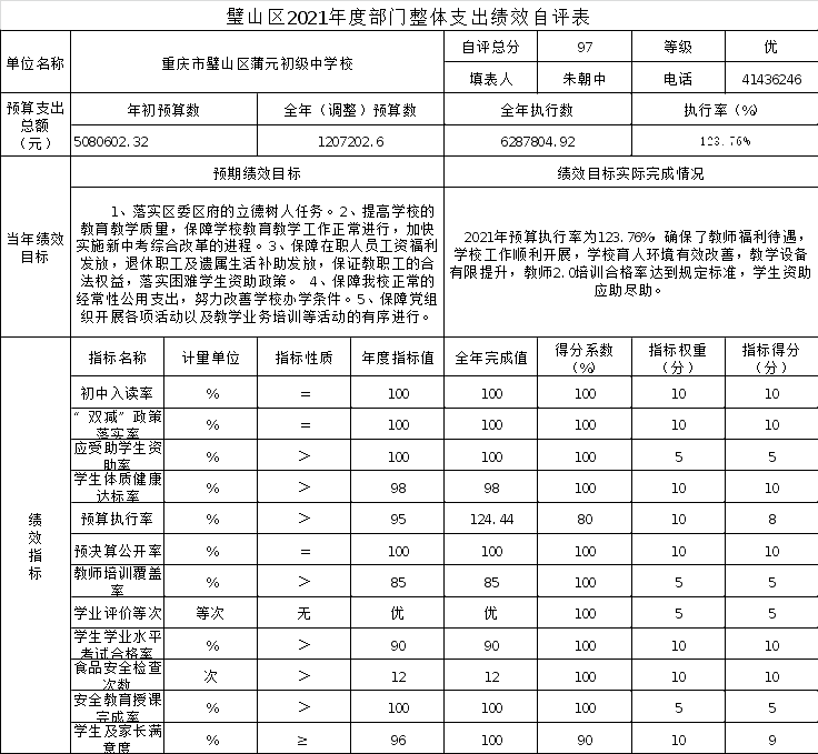 在财政资金的保障下,我校完成了年度各项工作目标任务。2020年部门整体支出绩效自我评价97分,自评结果:优。我校将在以后的工作中加强预算、决算管理制度,严格控制各项经费的开支,提高财政资金的使用效益。