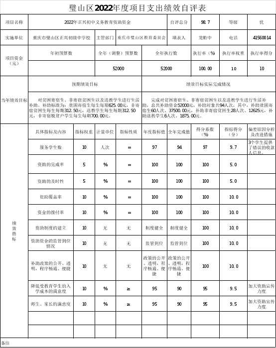 2022年实施了2022年正兴初中义务教育资助资金、正兴初中宿舍改建工程(结转)、正兴初中宿舍及运动场改造工程(结转),共计资金26.98万元。资金到位率100%。