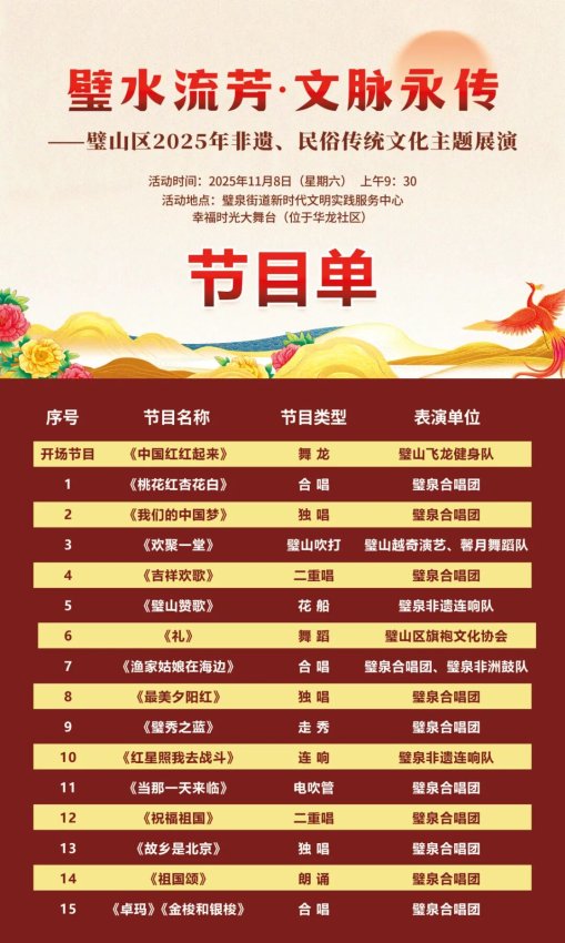 这个立冬,温暖与传承相伴!“璧水流芳·文脉永传——璧山区2025年非遗、民俗传统文化主题展演”即将在璧泉街道精彩上演。这是一场穿越时空的文化对话,一次传统与现代的艺术碰撞,邀您共同见证非遗文化的鲜活魅力!