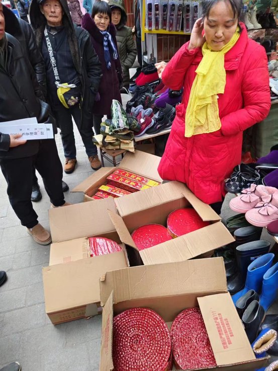 2023年12月18日,接12350举报,我区禁燃区域内有店铺非法储存经营烟花爆竹,我局联合区公安局、区市场监管局、区供销社开展联合执法,检查店铺4家次,查实非法储存烟花爆竹店铺3家次,扣押烟花爆竹8件、63圆、212板。