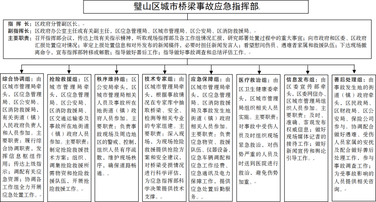 设立璧山区城市桥梁事故应急指挥部,负责统筹协调较大及以上事故,由指挥长、副指挥长和成员单位组成。