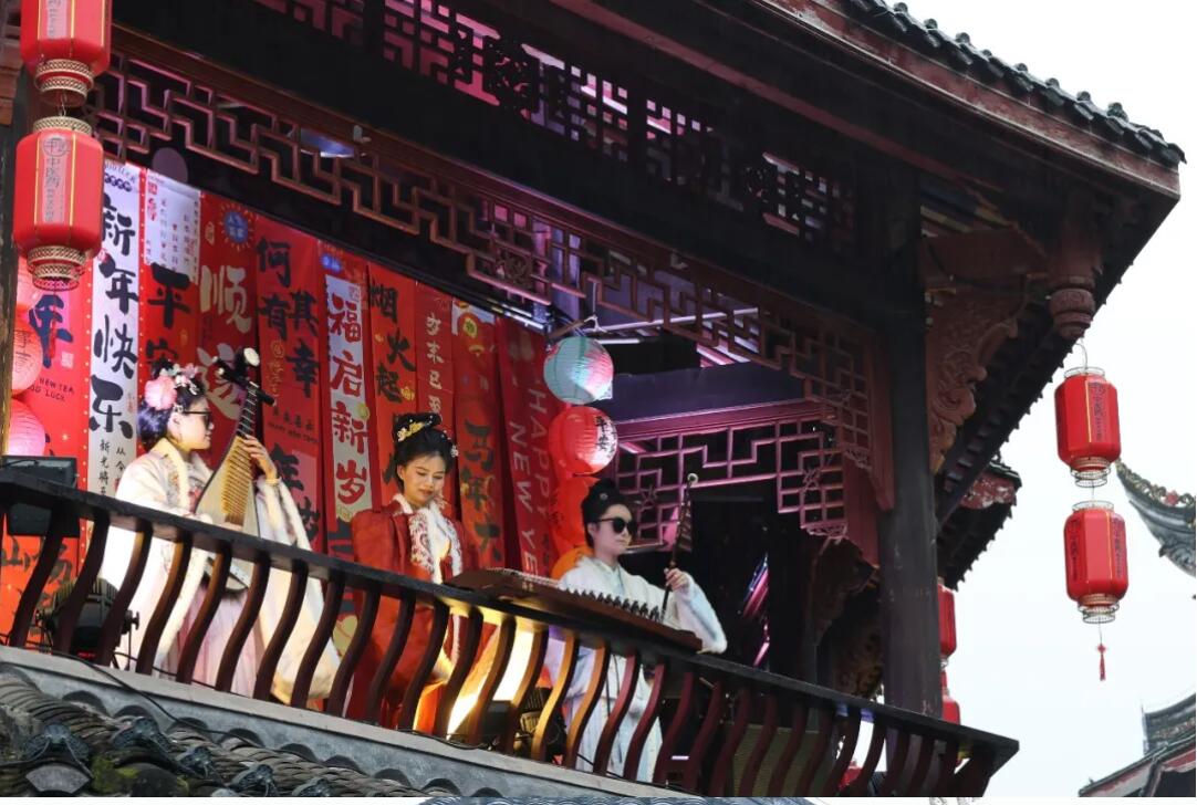 舞台上的文艺表演也为游园会增添了浓浓的年味与活力。惊险刺激的传统杂技、飘逸优美的古典舞蹈接连上演,引来阵阵掌声与欢笑,将现场气氛推向高潮。“山水清音”演奏会随后登场,阁楼木窗边,身着传统服饰的演奏人员端坐,却戴着一副现代墨镜,用古筝、琵琶、二胡等传统乐器相继奏响《沧海一声笑》《如愿》等流行曲目。古韵衣袂撞上摩登镜架,传统丝竹裹着新潮曲调,呈现出传统与现代交融的独特风貌,为现场观众带来耳目一新的视听体验。